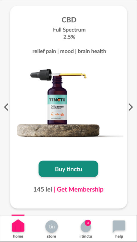 Tinctu is a health e-commerce app that targets to deliver high tech and very qualitative tinctures while offering support on how to live a balanced life.They are on a mission to adjust the way people understand tinctures and all natural products and share with everybody what technology those products need to be done with and how to include them in their daily routine.One of the biggest challenges for Tinctu is to amplify the confidence of the user regarding the all natural high tech products that serve well for : prevention, well being, emotional health, alternative medicine.The second big challenge for them is to create a platform that collects all the right information about the client and transforms that information in the best advices on how / when to take these products, so that they have a health guide all along.